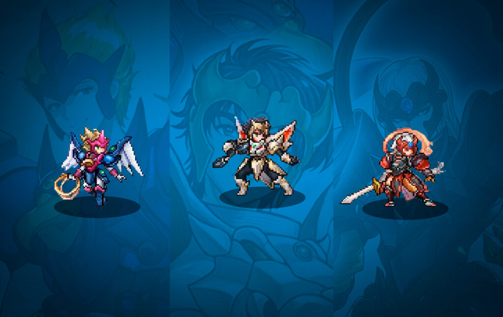Uma imagem promocional da parceria também foi divulgada (via 4Gamer), mostrando o conceito visual dos personagens para o jogo e suas formas em pixel art: